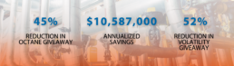 Our client is a Fortune 500 agricultural cooperative with a strong presence in North American agronomical and energy markets. They requested a non-capital margin improvement project to optimize blending practices and tools to sustainably reduce product quality giveaway. Over 26 weeks Trindent implemented 11 changes reducing octane giveaway by 45% and volatility giveaway by 52%, improving margins over $10,500,000.