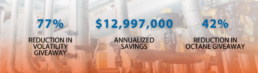 Our client is a Fortune 500 agricultural cooperative with a strong presence in North American agronomical and energy markets. They were seeking a non-capital margin improvement project to quickly and sustainably reduce product quality giveaway. Over 26 weeks Trindent implemented 12 changes that reduced volatility giveaway by 77% and octane giveaway by 42%, improving margins by $13 M.